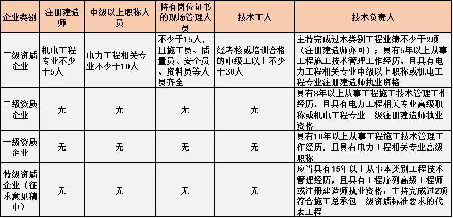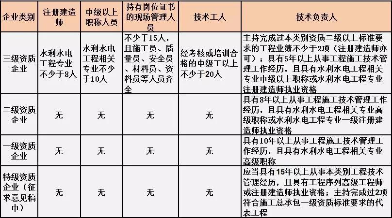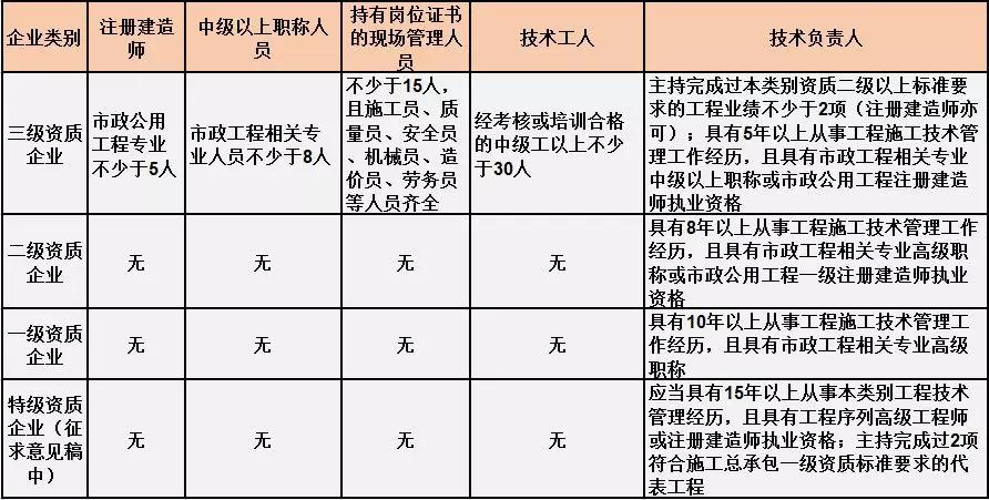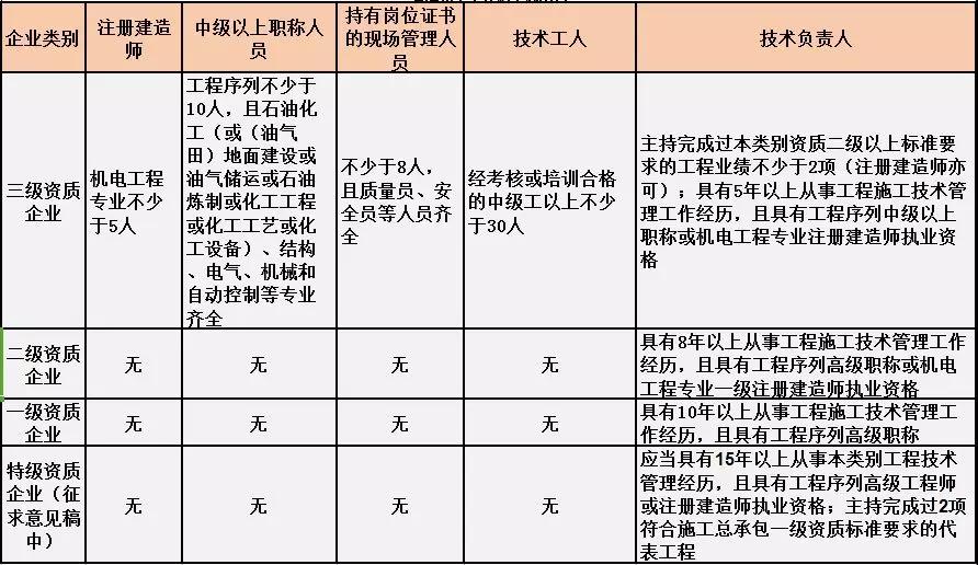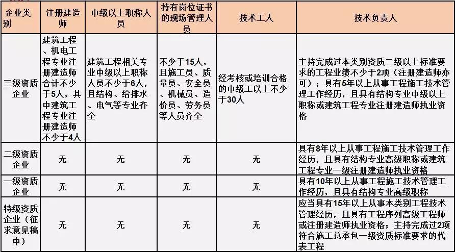 換句話說,并不是所有企業(yè)資質(zhì)都不要求有建造師等企業(yè)人員。施工總承包三級(jí)資質(zhì)企業(yè)對(duì)建造師等人員仍有要求,一級(jí)資質(zhì)、二級(jí)資質(zhì)企業(yè)保留技術(shù)負(fù)責(zé)人這一項(xiàng)要求,特級(jí)資質(zhì)另有規(guī)定。